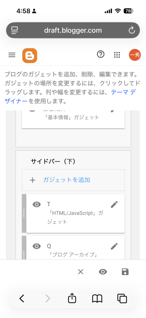 3)サイドバー(下)ガジェット追加をクリックします(ガジェットに貼る場合)