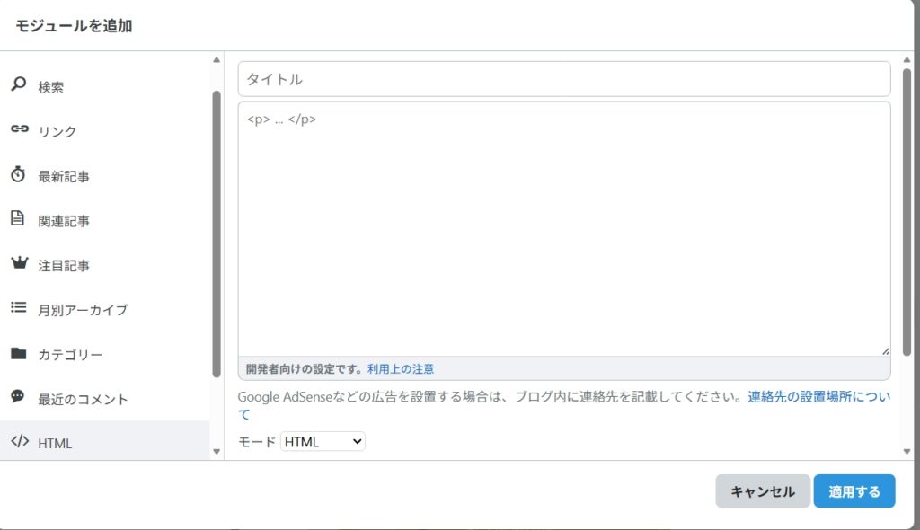 サイドバー>モジュール追加ー>HTMLを選択すると下記画面になりなます。