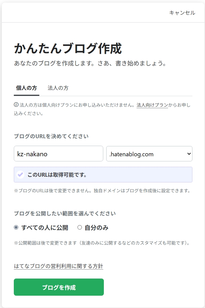 開設を申し込むと指定したメールアドレスにブログの開設方法が記載されてますので、それに従います。無料版を使います。以下はそおの一例です。